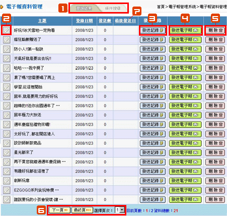 秀出所有登錄的電子報資料,可查詢、修改及刪除,並可發送電子報及查詢發送紀錄。